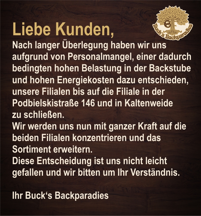 Buck's Backparadies aus Hannover und Langenhagen steht für traditionelle Rezepte in Verbindung mit rein natürlichen Zutaten ohne Zusatz- und Konservierungsstoffen. Entdecken Sie unsere Freude am Bäckerhandwerk und wie wir Sie unterstützen bei einer gesunden und natürlichen Ernährungsweise. Ebenso stellen wir Ihnen unsere wichtigsten Qualitätspartner aus Niedersachsen vor und erläutern Ihnen, was uns zu einem wahrhaftigen Backparadies auszeichnet.